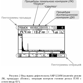 6.3 Вид экрана АКР1224М показан на рисунке 2. В зависимости от выбранной процедуры контроля количество и вид пиктограмм операций меняется. В режиме настройки дефектоскопа на экране присутствует список (меню) настраиваемых и справочных параметров.