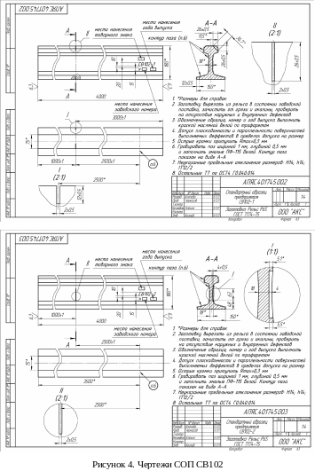 Чертежи СОП СВ102 показаны на рисунке 4. Комплект этого СОП состоит из двух образцов с разными моделями дефектов. Один из торцов каждого образца моделей дефектов не содержит и предназначен для калибровки дефектоскопа.