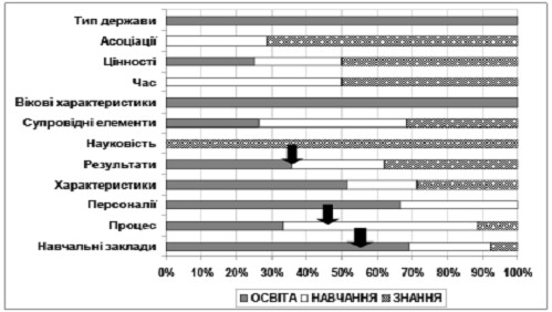 Водночас, за допомогою вільного асоціативного експерименту (ВАЕ) було встановлено, що, фактично, маркер «освіта» виявився полюсним для маркера «знання». А також те, що: