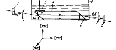 1- поляризатор; 2-анализатор; 3 - пьезопреобразователь; 4- поглотитель звука; 5 - кристалл молибдата кальция; 6 - кювета с силиконовым маслом