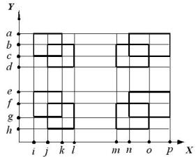 Пусть в двумерном пространстве XY заданы интервалы, ограниченные точками a, b, ..., h на атрибуте Y и точками i, j, ..., p на атрибуте X. В качестве базовых примем следующие открытые интервалы: