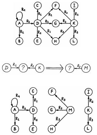 Семантические сети. Покажем, как в АК осуществляется вывод на семантических сетях [Kulik, 2010]. Каждую семантическую сеть можно представить как совокупность бинарных отношений. Правила вывода в семантической сети записываются в виде продукций, в левой части которых содержится какой-либо фрагмент семантической сети (соединения или композиции некоторых из исходных отношений), а в правой части – фрагмент, заменяющий левую часть или добавляемый в семантическую сеть как новое отношение при срабатывании правила. Например, отношение "быть внуком" появляется в результате композиции отношения "быть сыном" с самим собой.