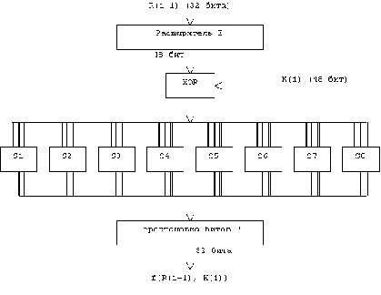 Е - расширение 32-битовой последовательности до 48-битовой,, S2,…, S8 - преобразование 6-битового блока в 4-битовый,