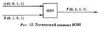 Логический элемент ИЛИ. На входы А и В логического элемента последовательно подаются четыре пары сигналов различных значений, на выходе получается последовательность из четырех сигналов, значения которых определяются в соответствии с таблицей истинности операции логического сложения.