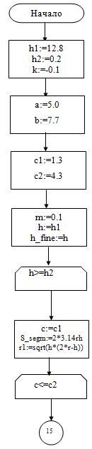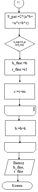 Шаг 6 - проверка условия, что если текущее значение высоты меньше минимального и одновременно (оператор AND) площадь поверхности шарового сегмента не меньше площади поверхности параллепипеда, то считать текущее значение высоты и радиуса основания сегмента минимальным (h_fine:=h; r_fine:=r1).