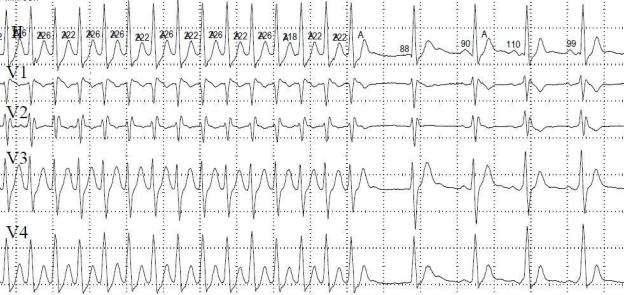 На ЭКГ: ритм не синусовый, не правильный. Интервалы R-R все разные.