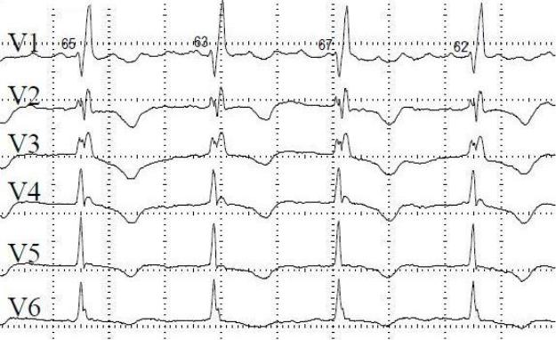 депрессия сегмента S-T, отрицательный или двухфазный Т в отведениях V1, V2 – блокада правой ножки п. Гиса.