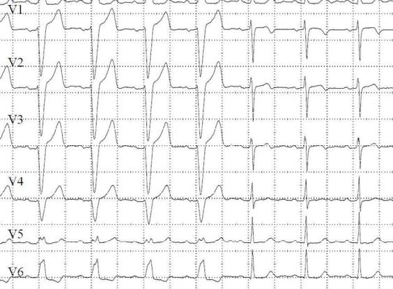 - Комплексы QRS типа rSR или rsR в отведениях V1, V2, в отведениях V5, V6–