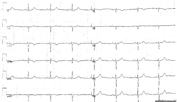 III, aVF, V1, V2 – глубокий и широкий зубец S, увеличение длительности комплекса QRS, депрессия сегмента S-T, отрицательный или двухфазный Т в отведениях I, aVL, V5, V6 – блокада левой ножки п. Гиса.