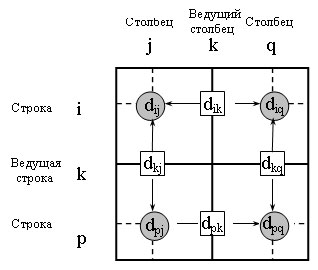 Шаг 5. Полагаем k = 5, ведущие строка и столбец в матрице D4 выделены. Никаких действий на этом шаге не выполняем; вычисления закончены.