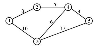 кратчайший путь от узла 1 до узла 5: 1->2->4->5. Длина этого пути