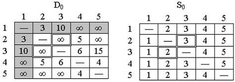 Шаг 0. Начальные матрицы D0 и S0 строятся непосредственно по заданной схеме сети. Матрица D0 симметрична, за исключением пары элементов d35 и d53, где d53 равно бесконечности, поскольку
