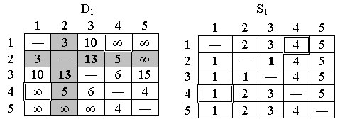по крайней мере, через один промежуточный узел. Например, поскольку s15 = 4 и s45 = 5, сначала кратчайший маршрут между узлами 1 и 5 будет