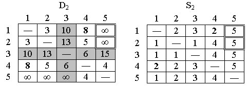 Конечные матрицы D4 и S4 содержат всю информацию, необходимую для определения кратчайших путей между любыми двумя узлами сети. Например, кратчайшее расстояние между узлами 1 и 5 равно d15 = 12.