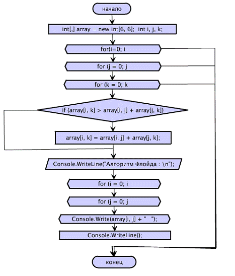 };, j, k;(i= 0; i< 6; i++)(j = 0; j < 6; j++)(k = 0; k < 6; k++)(array[i, k] > array[i, j] + array[j, k])[i, k] = array[i, j] + array[j, k];