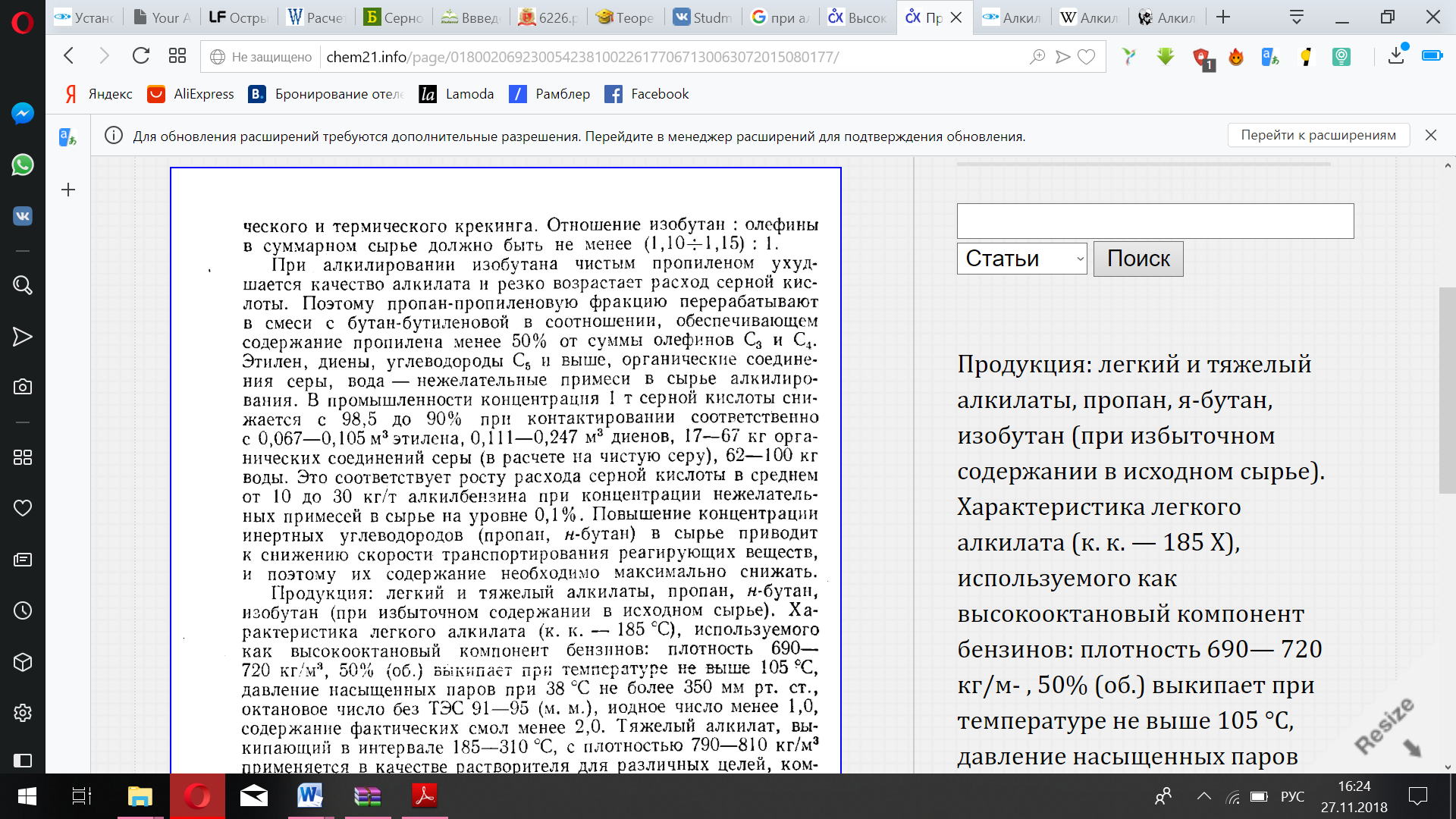 Наряду с основными реакциями С-алкилирования изобутана бутиленами, при которых на 1 моль изобутана расходуется 1 моль олефина, в процессе протекают и побочные реакции, приводящие к образованию продуктов, более легких или более тяжелых, чем целевой продукт, или к потере активности и увеличению расхода катблизаторов.