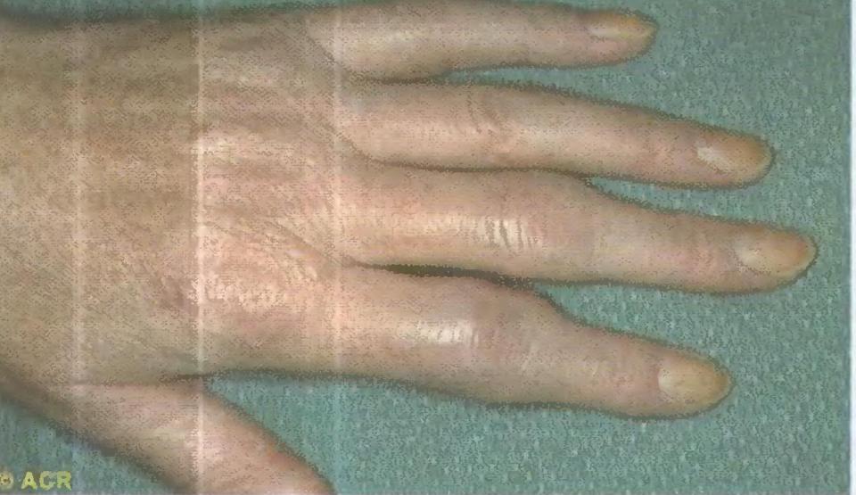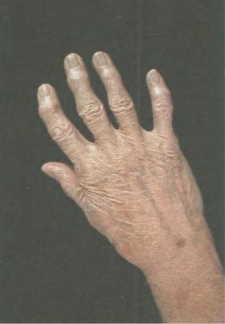 Следующий признак артрита - припухлость сустава, что объясняется появлением воспалительного отека в синовиальной оболочке и мягких тканях, окружающих сустав, а также наличием выпота в суставной полости. Припухлость, а при хроническом артрите - гипертрофия синовиальной оболочки и фиброзно-склеротические процессы в периартикулярных тканях приводит к так называемым дефигурациям суставов, выраженность которых может изменяться в течение болезни и под влиянием терапии. Стойкие же изменения формы сустава за счет деструкции суставных концов костей,костных разрастаний, анкилдозов, подвывихов, повржедение сухожильно-связочного аппарата называют деформацией суставов. Типичные деформации пальцев кистей при ревматоидном артрите-ульнарная девиация,"шейка лебедя","бутоньерка" и др. -образно называют "визитной карточкой" этого забоевания.