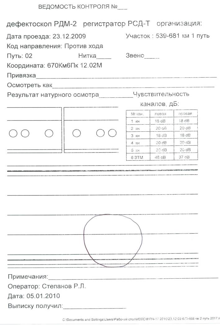25.12.09 г. АДС-02 № 151205, оператор 7 разряда Усанов Е.Б., дефектов на 556 км не обнаружено. Расшифровку производил 25.12.09 г. наладчик с правом расшифровки Балашов С.В. Замечаний по расшифровке не выдавалось.