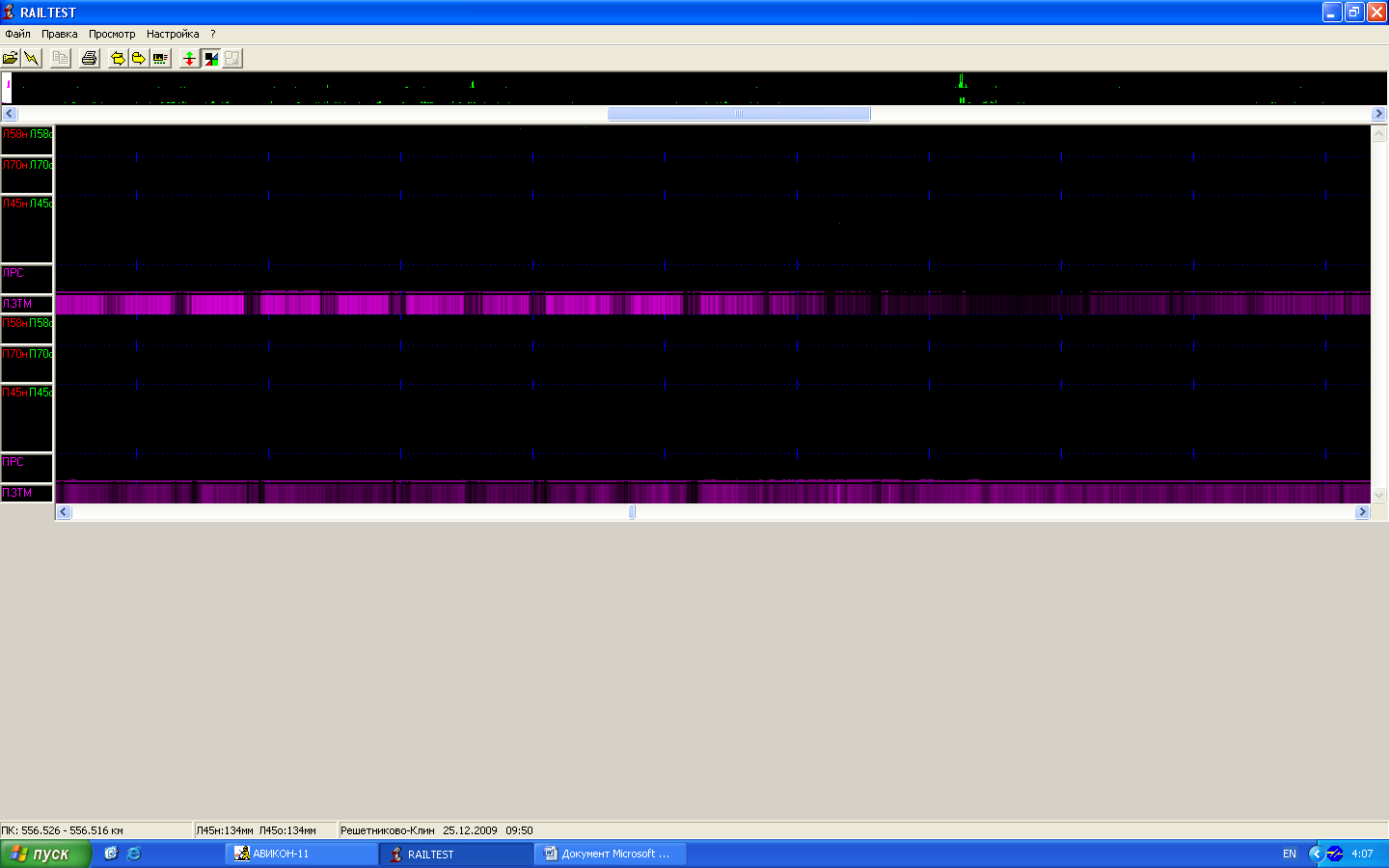 11.12.09 г. Авикон-11 № 06095, оператор 7 разряда Фёдоров А.А., дефектов на 556 км не обнаружено. Расшифровку производил 11.12.09 г. наладчик с правом расшифровки Балашов С.В. Замечаний по расшифровке не выдавалось.