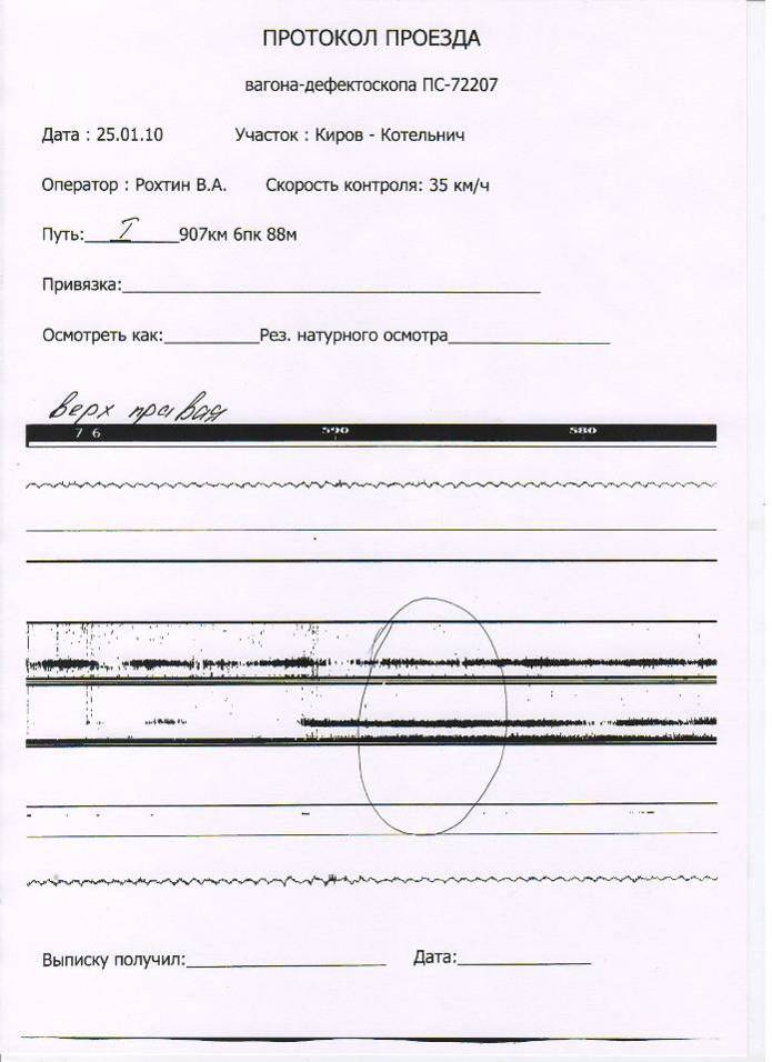 - 28.01.10г. дефектоскопом РДМ-22 №289 (со встроенным регистраторам) оператор 7 разряда Паршин А.В., на дефектограмме имеются сигнал от дефекта, а рельс на замену не был выдан.