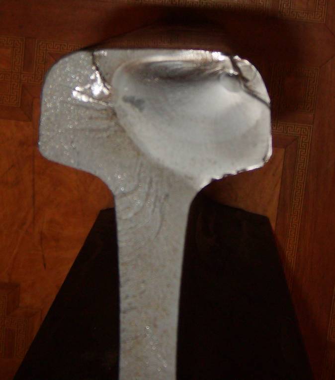 Рисунок дефекта по НТД/ЦП-2-93 21.2,расположение излома по сечению рельс вертикальный. Наличие, местоположение и размер усталостных трещин или других дефектов светлое пятно в головке рельса 50×45 мм.