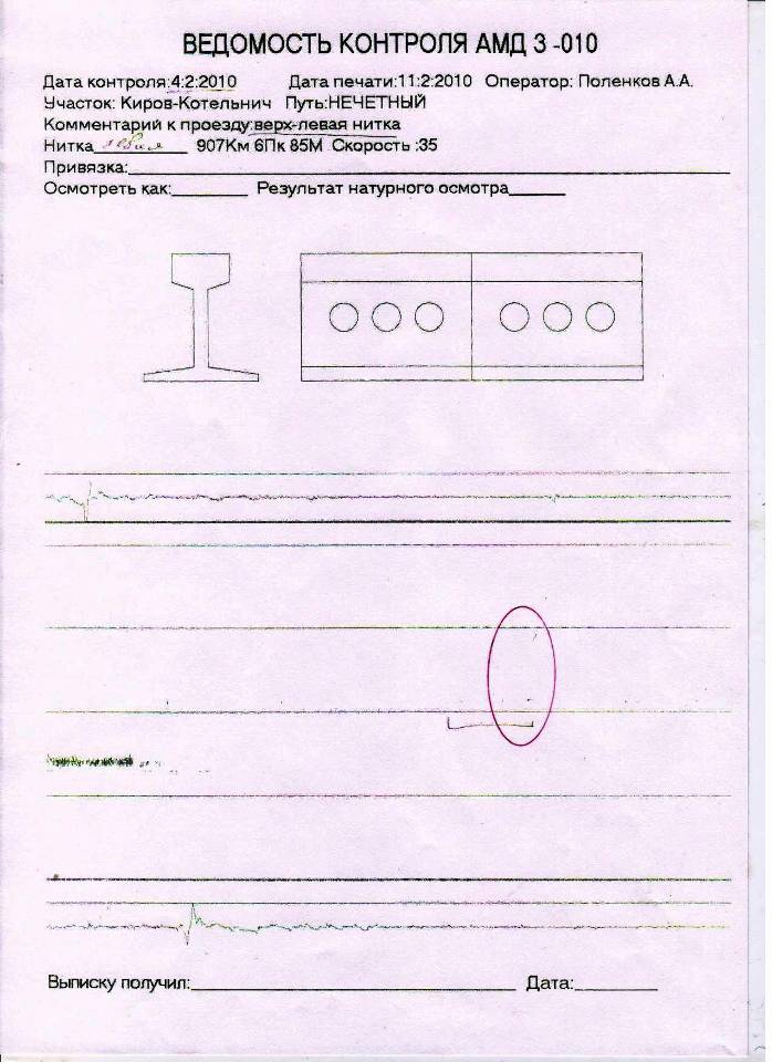 При анализе дефектограммы дефектоскопной автомотрисы АМД – 3№010 от 04.02.2010 г. выявлен сигнал от дефекта в головке на 6 пк 85 метре, который не был выдан на вторичный натурный осмотр.