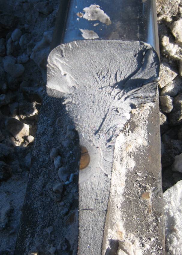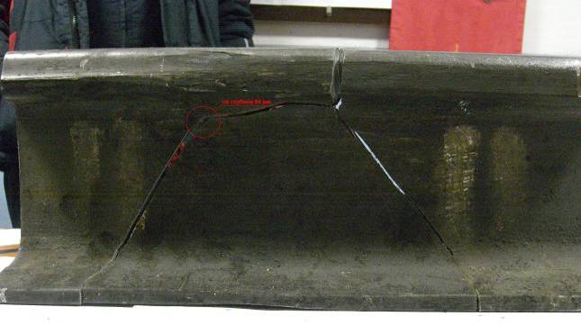 Предполагаемая причина излома – дефект по коду 56.3 трещина в шейке в месте сварного шва заходящая в проекцию шейки рельса на 6 мм., высотой 15 мм. (состоящая из двух фрагментов 6×5 мм., и 6×10 мм.), расположенная под углом 25 градусов к поверхности рельса, на глубине 50 мм. От поверхности катания. Концентратором развития дефекта явилась перешлифовка на шейки рельса протяженностью 60 мм., шириной 3 мм., глубиной 1,2 мм.
