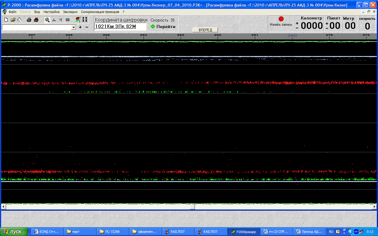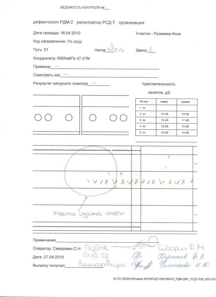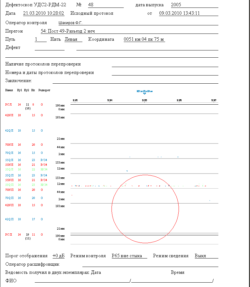 - 09.03.2010 г. дефектоскоп РДМ-22 № 48 регистратор встроенный операторы Шакиров, Марданов, сигналов от дефекта нет;