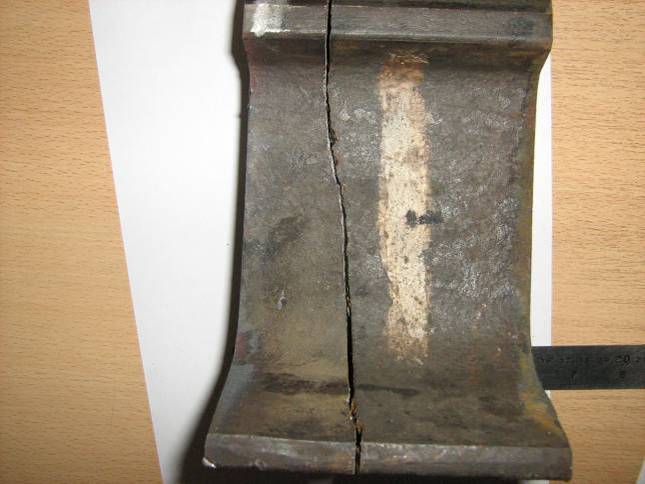 Предполагаемая причина излома хрупкое разрушение подошвы рельса в зоне сварного стыка из-за наличия двух пятен от поджога. Код дефекта 66.3.