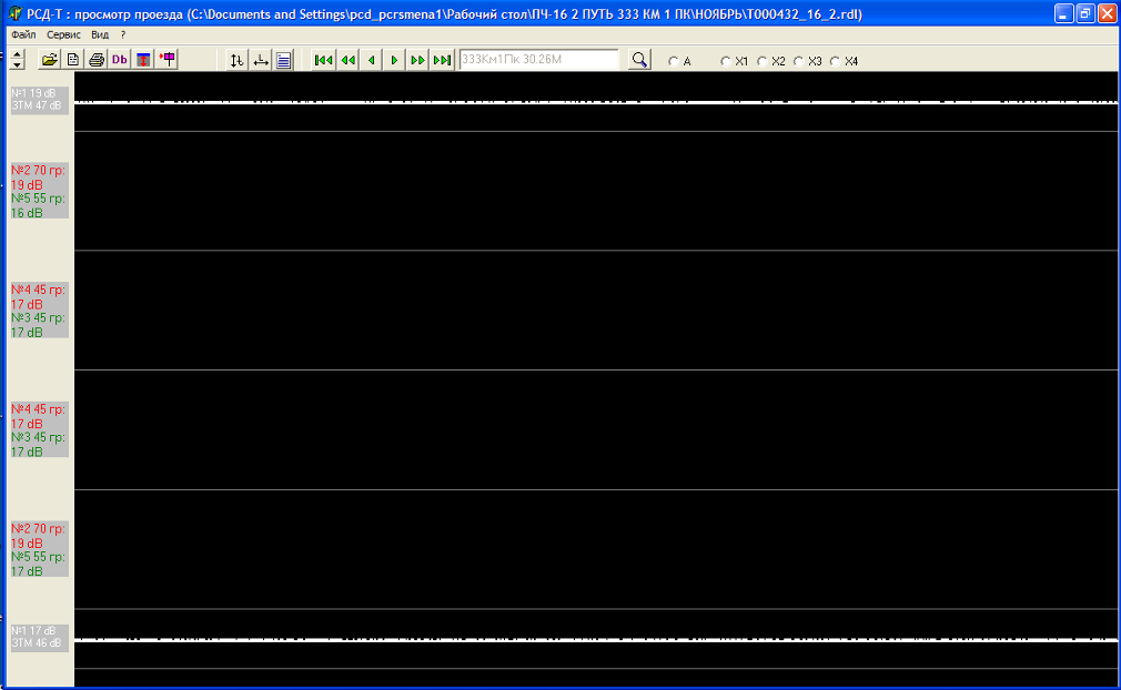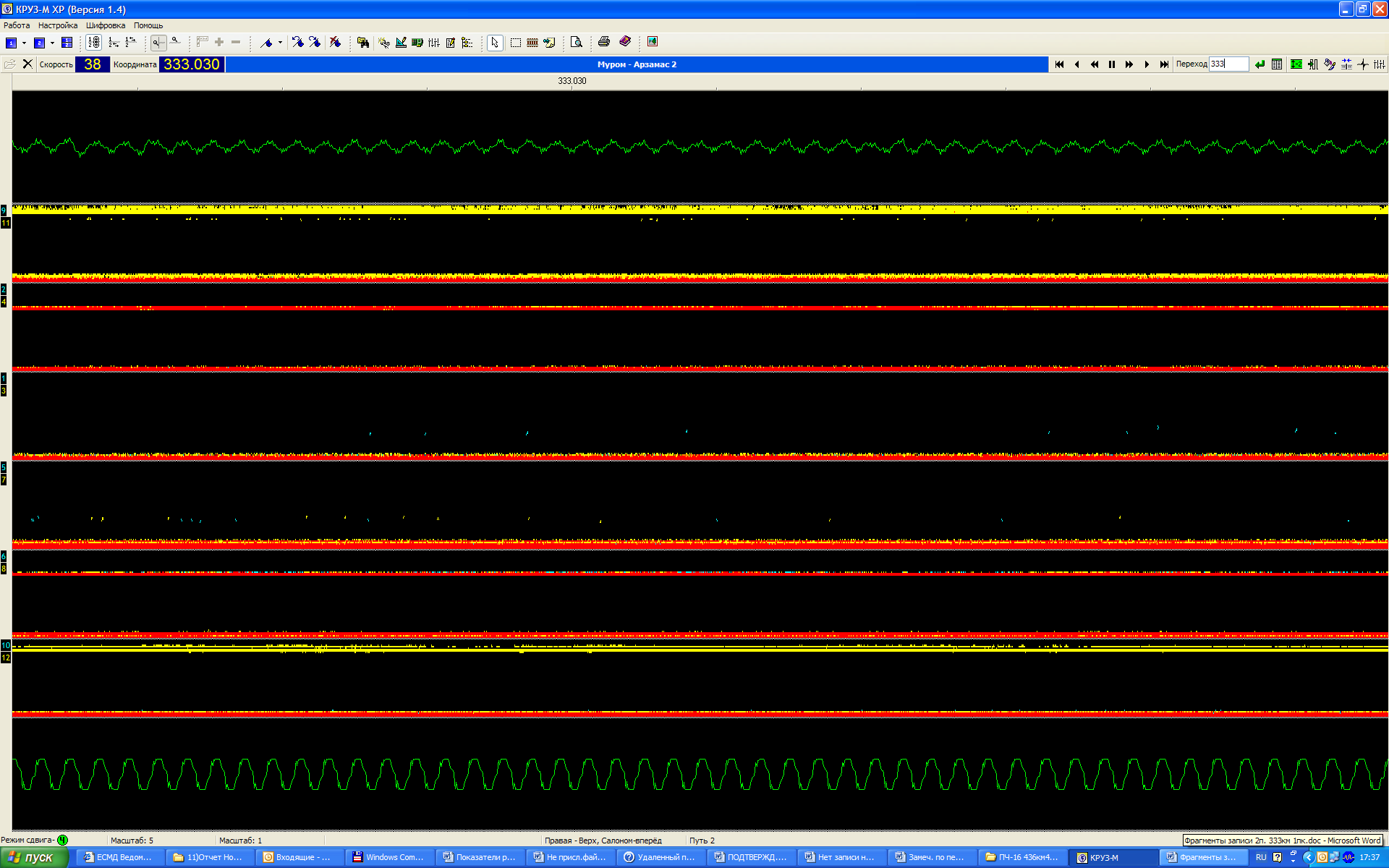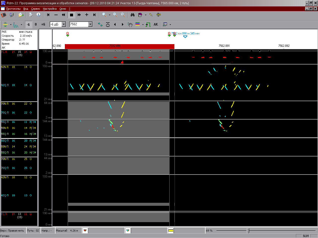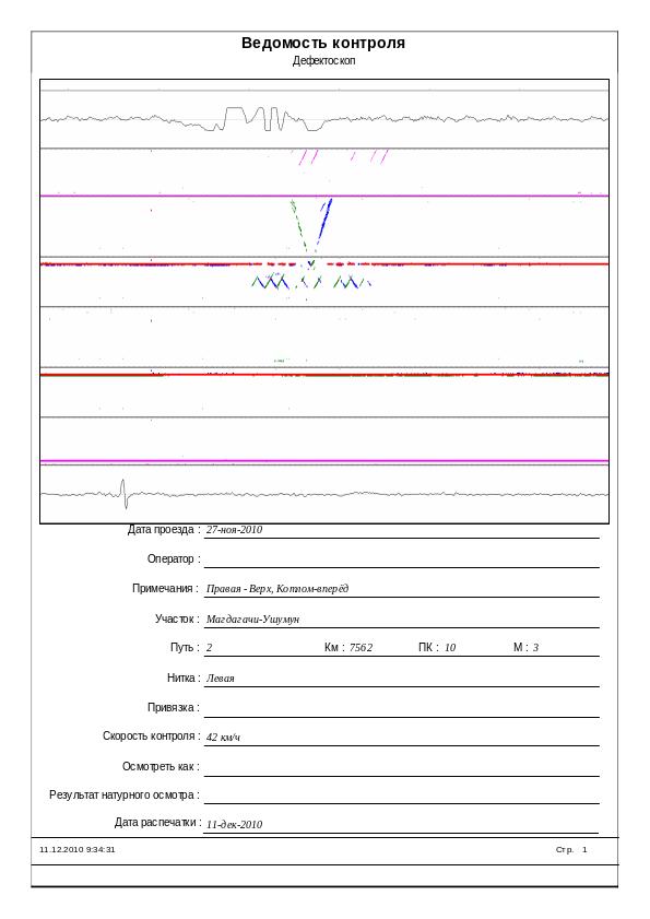 - 25.11.2010г. дефектоскопная тележка РДМ-2 №526, операторы Сергеев О.В., Улетов О.И. дефектов при расшифровке не обнаружено, отметок на вторичный контроль не выдавалось, на дефектограмме сигналы от дефекта отсутствуют, по качеству записи и настройке замечаний не выявлено.