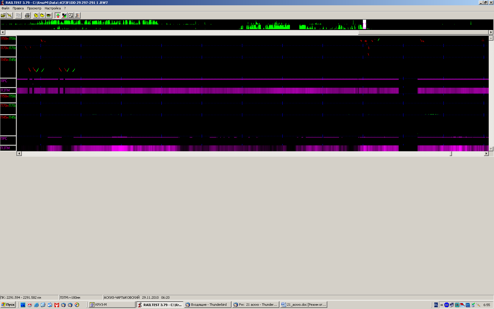 - 22.11.10г. совмещенный вагон-дефектоскоп № 72053, руководитель смены Карачевцев А.М., дефект не обнаружен, на дефектограмме имеются признаки дефекта.