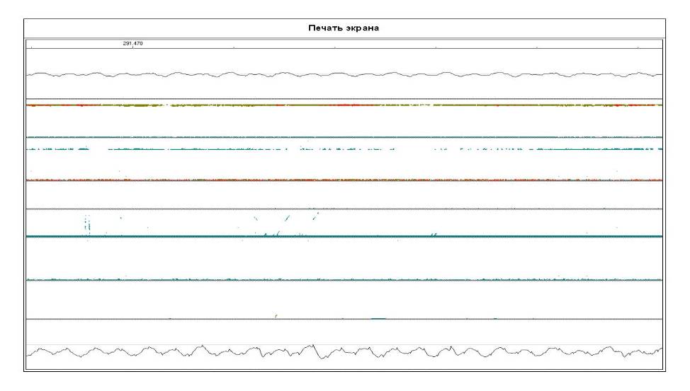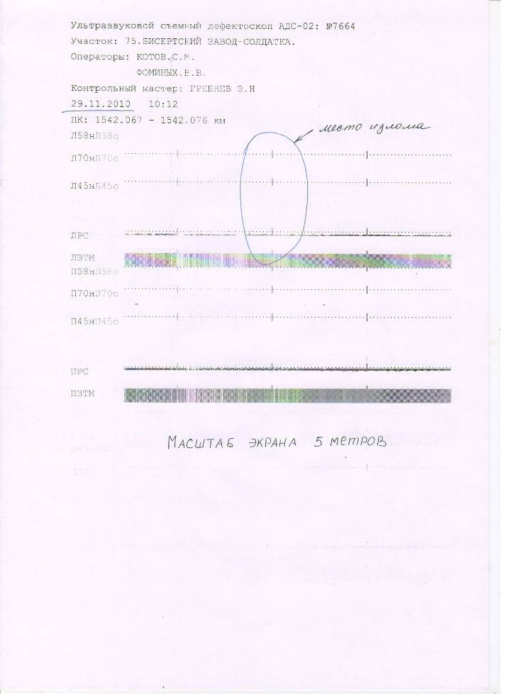 - 17.11.10г. съемный дефектоскоп АДС-02 № 040106, оператор Яськин И.В., дефект не обнаружен. На дефектограмме регистратора имеются признаки дефекта. Выдавался на вторичный контроль расшифровщиком регистраторов Покачаковым А.С., при вторичном контроле подтвержден дефект по коду 11.2.