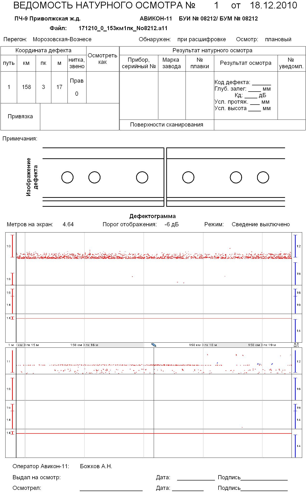 - 17.12.2010г. Авикон-011 №08212 оператор Родин А.А. сигналов от дефекта не обнаружено.