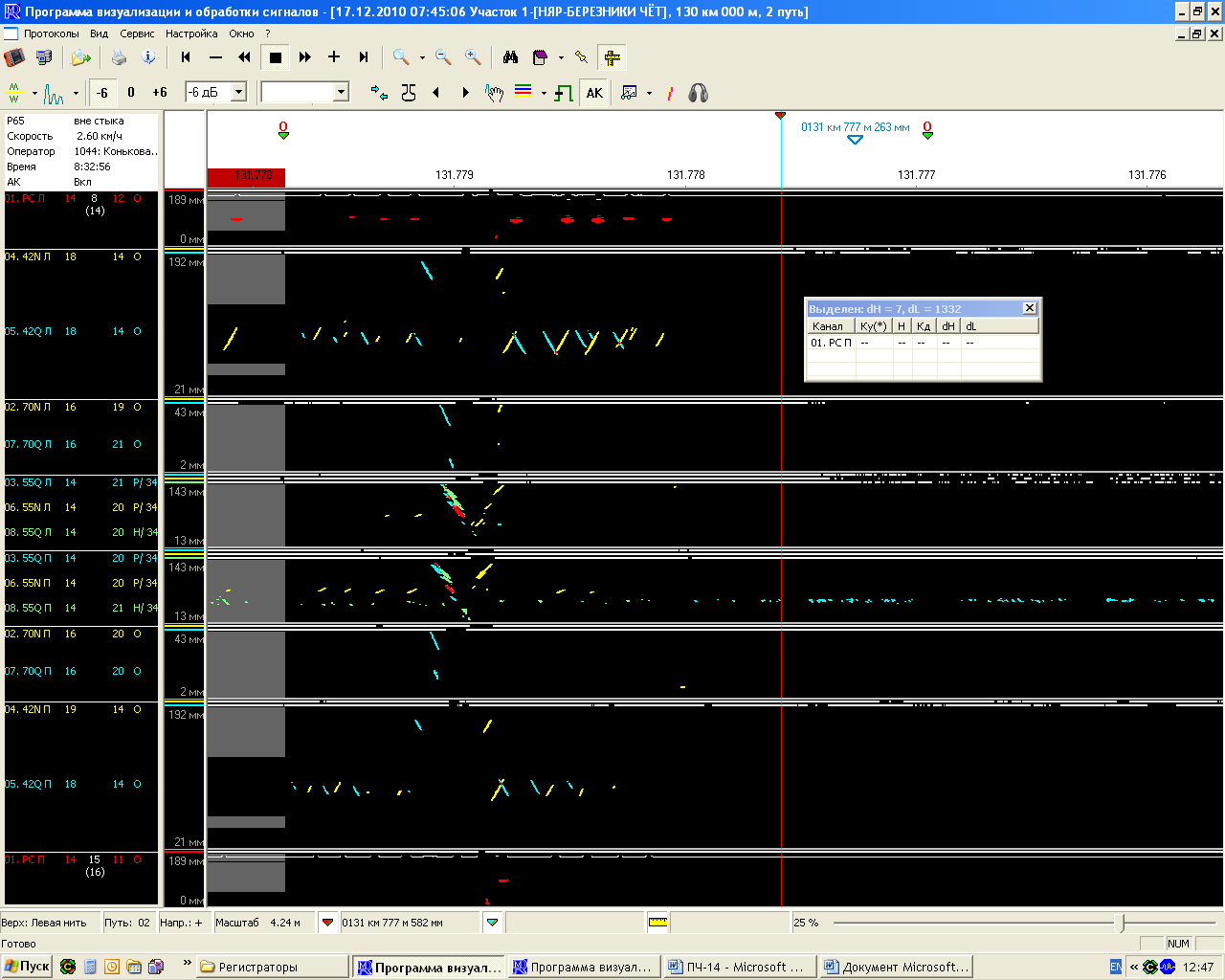 Проезд от 06.12.10. автомотриса МКТП-063, участок проверки Яйва-Кизел, 131км 8пк правая нитка. Сигналы от дефектов отсутствуют