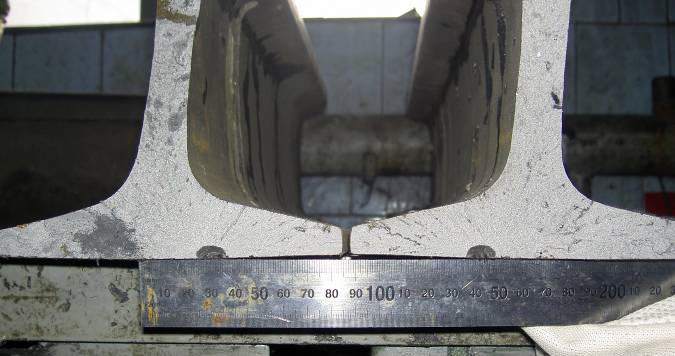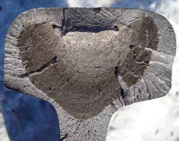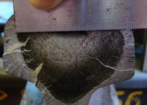 Код дефекта согласно НТД/ЦП-2-93 21.2 Расположение дефекта по сечению рельса: по центру головки рельса дефект размером, ширина 57мм, высотой 45мм, без выхода на поверхность рельса. Зазор в месте излома составлял 37мм.