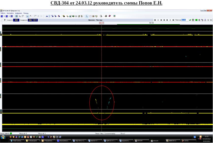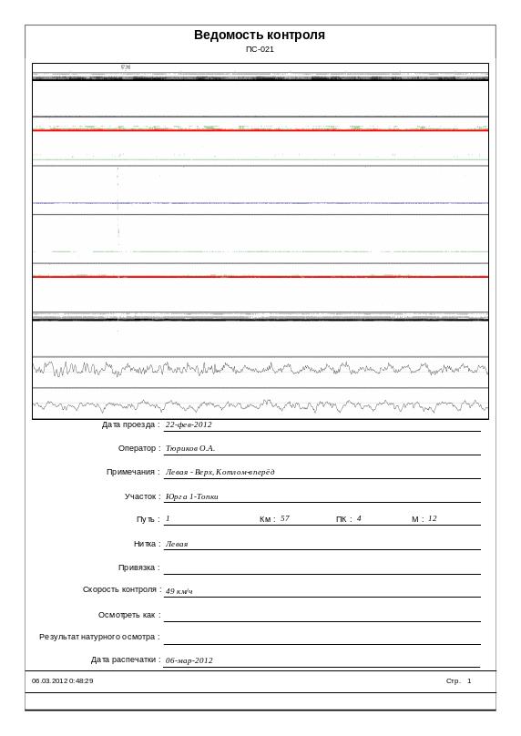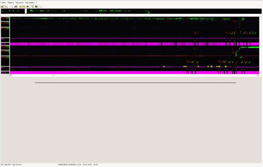 - 24 марта 2012г. совмещенный вагон-дефектоскоп № 304. Имеются сигналы от дефекта, отметка выдавалась на вторичный контроль в суточный срок (ведомость №70 от 24 марта 2012 г.). Качество записи удовлетворительное.