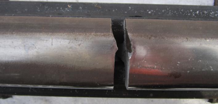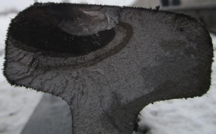 8. Предполагаемая причина излома рельса – на данном дефектном месте 14.10.2011 г. проводилась наплавка закалочного слоя для устранения дефекта по коду 14, фирмой «ООО» Сплав. Из-за неравномерного нагрева и охлаждения образовалась, микротрещина и в процессе эксплуатации произошел рост дефекта в головке рельса, геометрические размеры дефекта на момент излома 43 х 30 мм в нерабочей грани головки рельса.