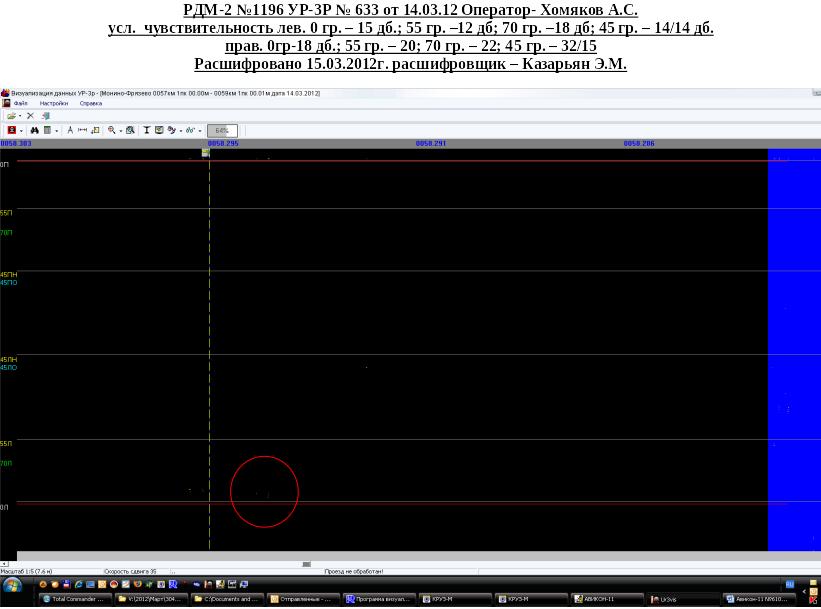 - 14 марта 2012г. дефектоскоп РДМ-2 № 1196, регистратор УР-3Р №633, оператор Хомяков А.С. Имеется сигнал от поверхностного расслоения закалочного слоя только от 70 гр. преобразователя. Качество записи удовлетворительное.