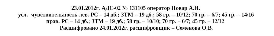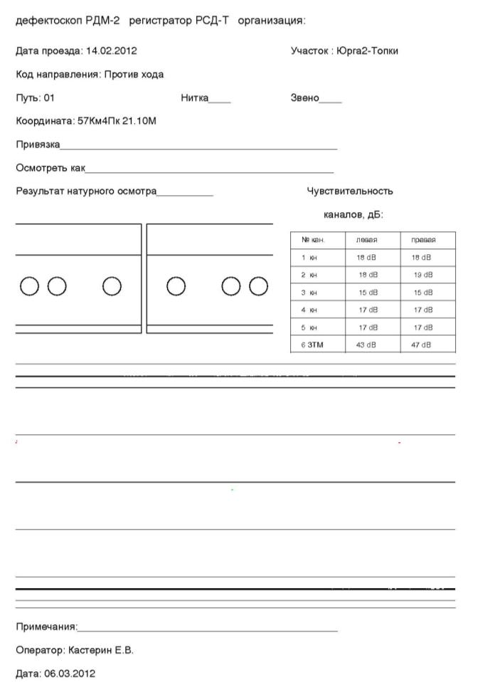 - 12 января 2012г. дефектоскоп РДМ-22 № 425, регистратор встроенный, оператор Украинцев С.С. Сигналов указывающих на наличие дефекта нет. Качество записи удовлетворительное.