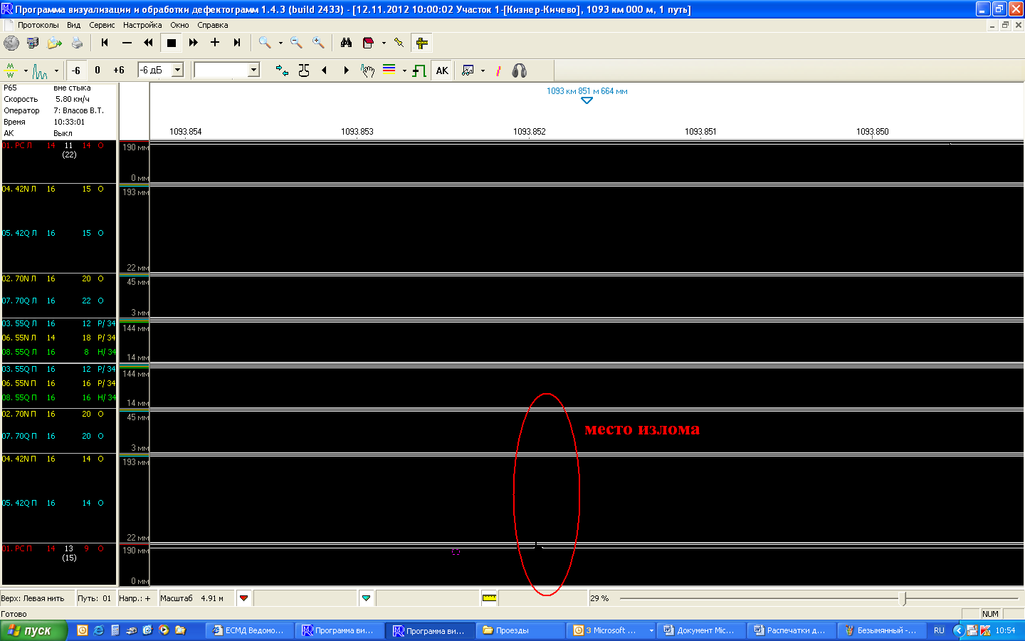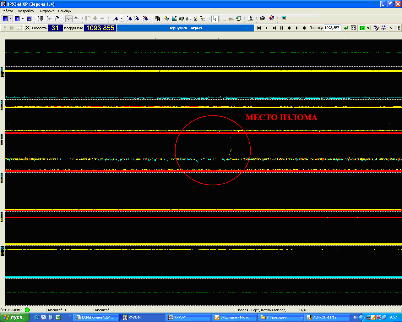 Дефектограмма места излома масштаб 5 м