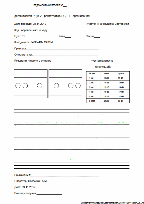 - 08.11.2012 РДМ-2 №2287 оператор Наклескин А.М., расшифровка 08.11.2012 расшифровщик Ильиных А.В. сигнал от дефекта отсутствует.