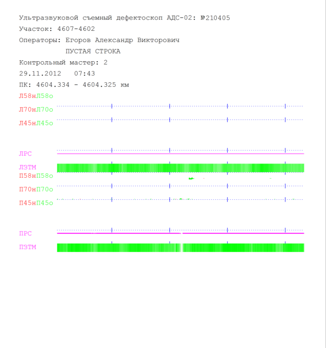 -16.11.2012г вагон дефектоскоп ВМ №79046, начальник Марфичев Д.А. Дефектов не обнаружено, сигнал от дефекта на дефектограмме отсутствует.