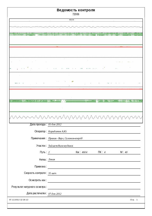 01.12.2012 г. вагон-дефектоскоп № 72006, смена начальника вагона Попов Н.Д. (качество контроля рельсов удовлетворительное, чувствительность каналов контроля дефектоскопа соответствует нормативным).