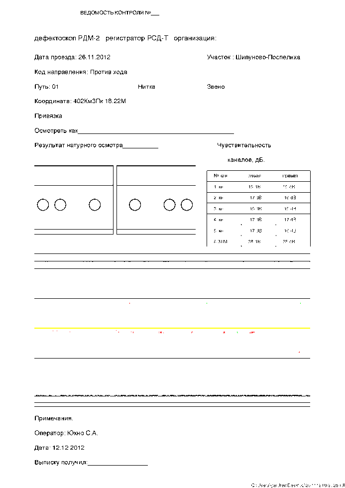 - 26.11.12 РДМ-2 №2025 оператор Юхно С.А. расшифровка 27.11.12 расшифровщик Жуков А.С. сигналы от дефекта отсутствуют;