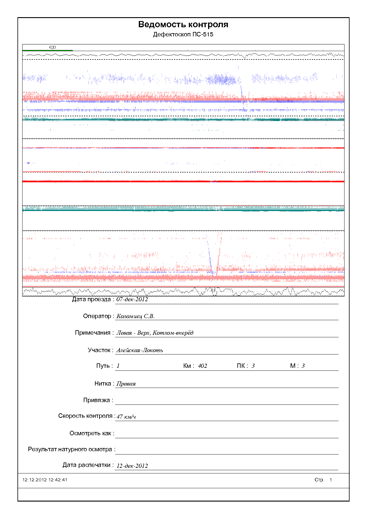 05.11.2012 г. вагон дефектоскоп №441, ПС Алентьев К.В., сигналов от дефекта нет, дефектов не обнаружено, качество записи удовлетворительное;
