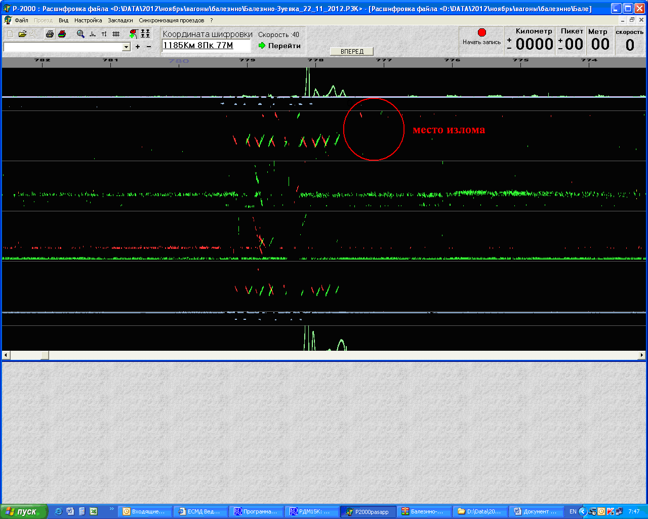 - 20.11.2012 г. АДС-02 №1122 оператор Князев П.С. – присутствует сигнал от отъезжающего и наезжающего канала 42° оператор дефект не выявил. При расшифровке дефектограммы в центре расшифровки, инженер Латыпова Е.В, сигнал от дефекта не выявила и отметок на вторичный контроль не выдала.