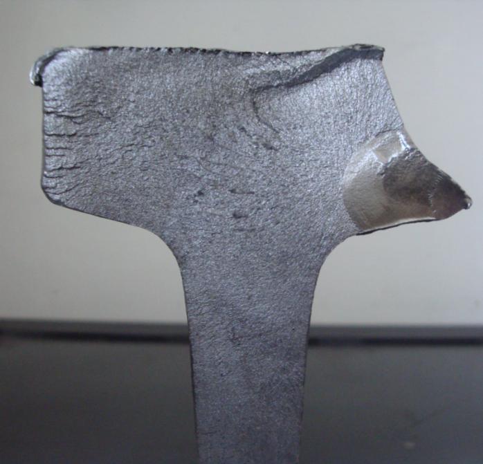 Расположение дефекта по сечению рельса – трещина в пере подошвы рельса на расстоянии от оси сварного шва 97 мм (по подошве). Развитие дефекта по перу подошвы с наружной стороны в виде темного пятна площадью 18х15 мм. Поперечный излом от подошвы рельса произошел под углом 20°.