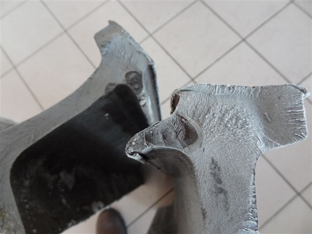 8. Предполагаемая причина излома – излом рельса произошел из-за развития дефекта в виде темного пятна в головке рельса со стороны не рабочей грани на глубине 18 мм от поверхности катания, высотой 14 мм, шириной 34 мм. Код дефекта согласно НТД/ЦП-2-93 – 21.2. Место излома расположено на расстоянии 20 мм от края подкладки в шпальном ящике.