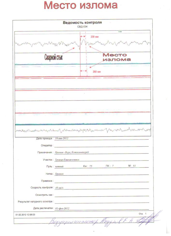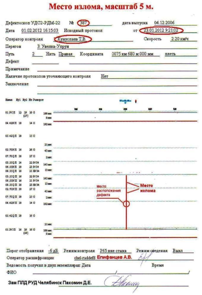 - 6.01.2012 проверено съемным дефектоскопом типа УДС-РДМ-2 № 2532 с регистратором УР- 3Р № 1091 оператор Зеленкин Ю.И. сигнала от дефекта на дефектограмме отсутствует.