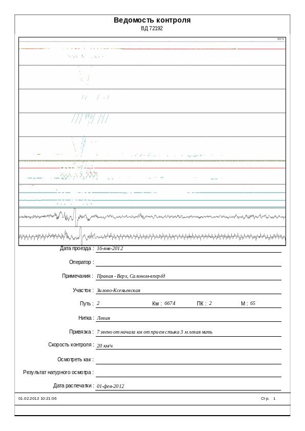 - 16.01.2012 г проверено ультрозвуковым вагоном ВД №72192 дефект не обнаружен, сигнала от дефекта на дефектограмме нет.